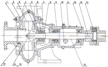 本型排污泵主要由:泵盖(1),泵体(2),叶轮(3),轴(15),轴封体(4),轴承箱(11))及联轴器部件等组成〈见图1:结构图〉