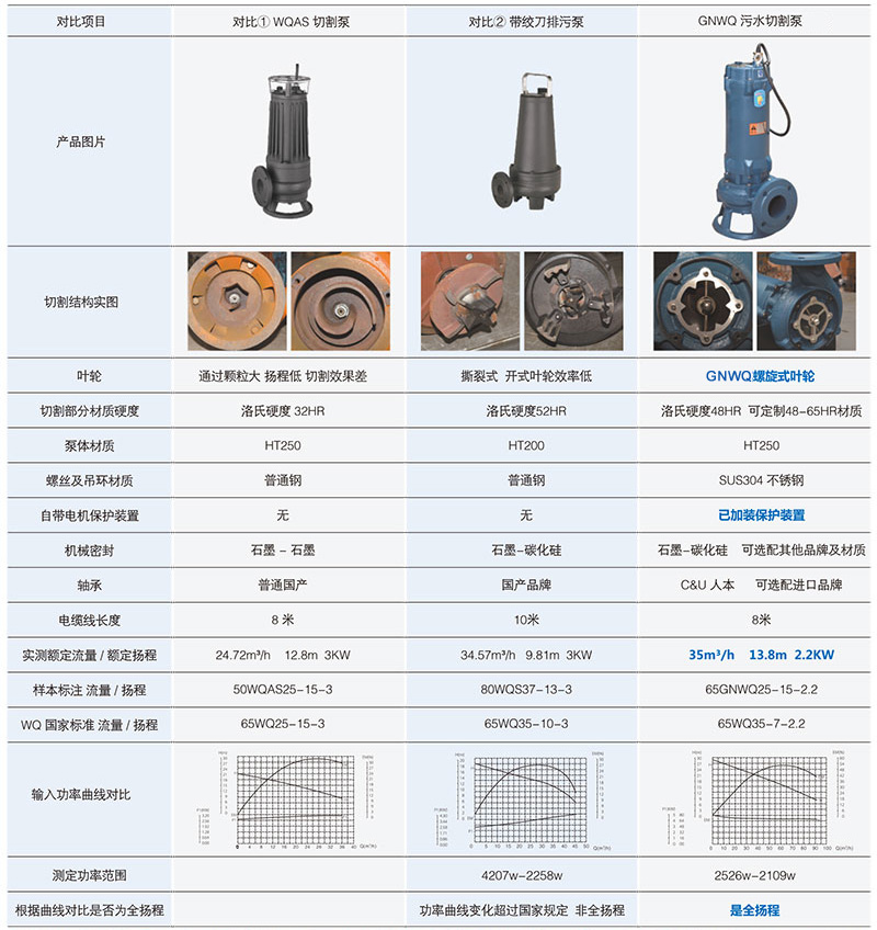 GNWQ切割排污泵与市场上其它切割泵的对比
